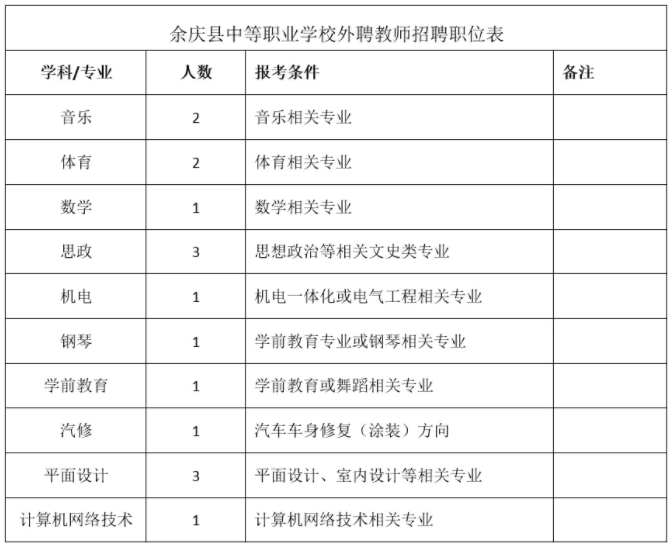 (一)招聘對象1.大專及以上學歷的應往屆畢業(yè)生;2.戶籍不限;3.具體要求詳見《余慶縣中等職業(yè)學校外聘教師招聘職位表》。(二)報考條件1.具有中華人民共和國國籍,遵守憲法、法律和法規(guī),品行端正;2.年齡在18周歲及以上;3.具有符合崗位要求的文化程度、工作能力和資格條件;4.具有正常履行職責的身體條件;5.具備招聘崗位所需的其他資格條件。6.文化課教師原則上要求具有本科及以上學歷、相同學科教師資格證;專業(yè)課教師具有大專及以上學歷,相關(guān)專業(yè)教師資格證或職業(yè)資格證,具有3年及以上企業(yè)工作經(jīng)歷者可優(yōu)先錄用。(三)以下人員不得報考1.因犯罪受過刑事處罰的;2.不符合招聘對象、報考條件或職位所需資格條件的;3.法律、法規(guī)規(guī)定不得聘用的。四、發(fā)布招聘公告、報名及資格審查