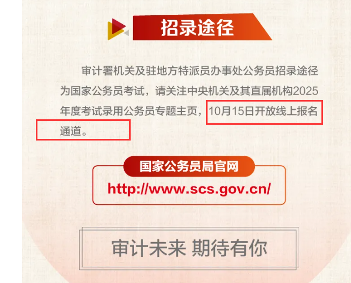 近日,審計署機關(guān)及駐地方特派員辦事處發(fā)布相關(guān)消息,表示2025年國家公務(wù)員招錄10月15日開放線上報名通道。