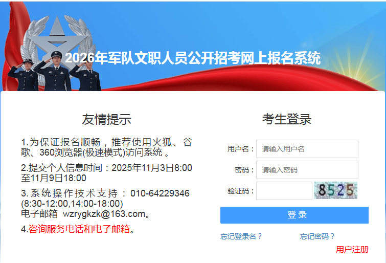 2.資格條件初審。2025年11月3日8:00至11月11日18:00,中央軍委機關(guān)部委、戰(zhàn)區(qū)、軍兵種、中央軍委直屬單位、武警部隊政治工作部門通過軍隊人才網(wǎng)報名系統(tǒng)對報考人員填報的信息進行初審,確認(rèn)是否符合報考條件,一般2天左右反饋初審結(jié)果。通過資格條件初審的,不能修改報名信息或者在啟動調(diào)整報名崗位前改報其他崗位。2025年11月3日8:00至11月9日18:00未通過資格條件初審的,可以改報其他崗位。