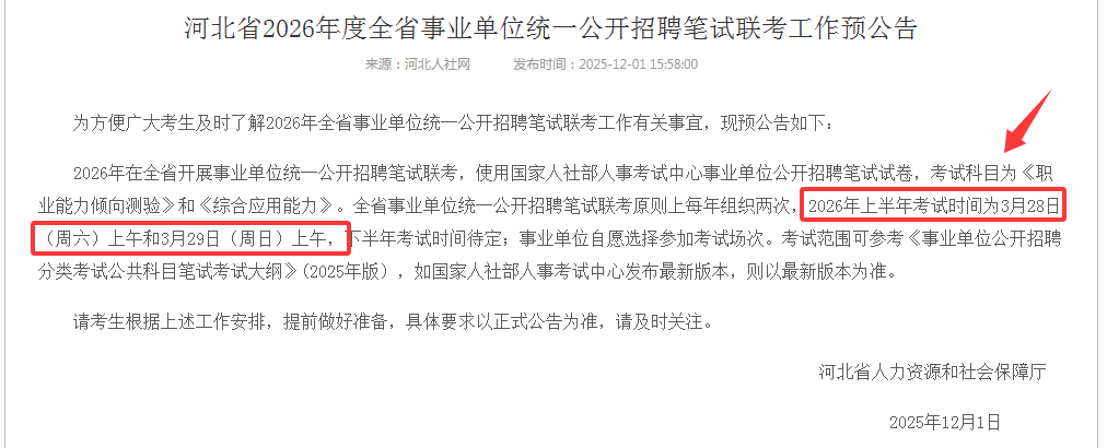 原標(biāo)題:河北省2026年度全省事業(yè)單位統(tǒng)一公開招聘筆試聯(lián)考工作預(yù)公告